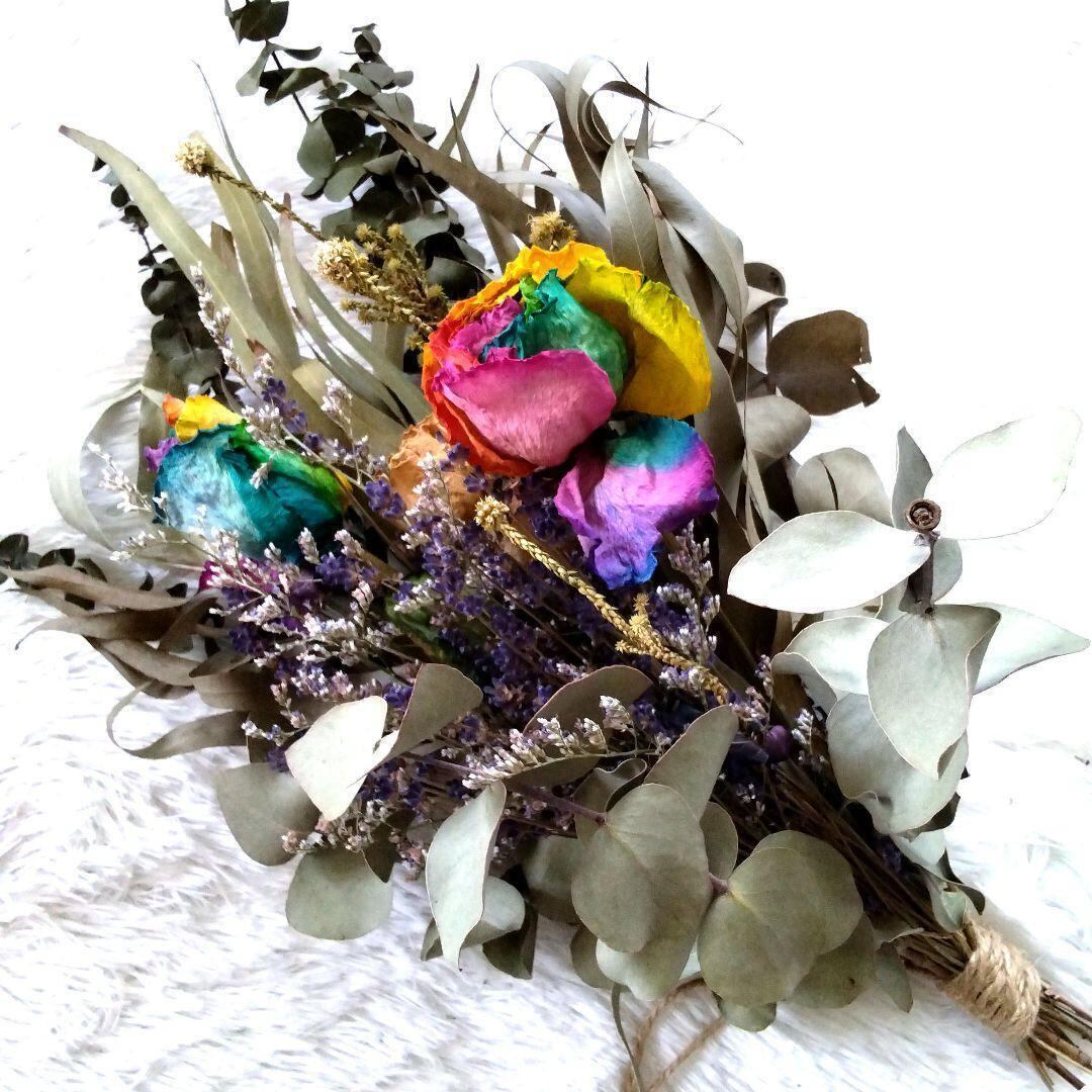 レインボーカラーの染め薔薇、ラベンダー、ユーカリ銀世界、柳葉ユーカリなど(*^^*)
